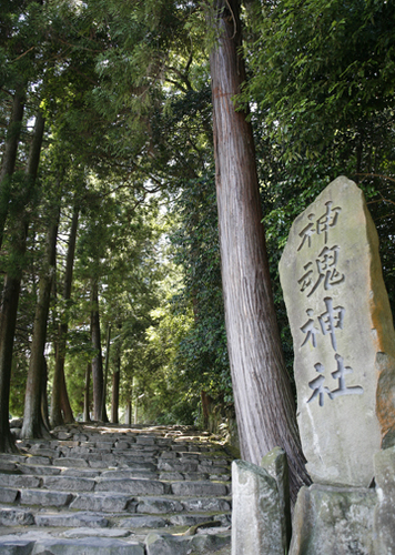 神社の鳥い正面に「神魂神社」と彫った古い碑が建っています。鳥居の先には、ゆっくりとした勾配の石畳の参道が続いています。