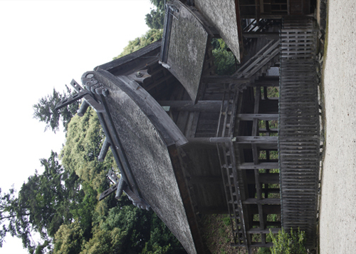 何が言いたいかというと、出雲大社よりずっと古いということです。神魂神社の大社造は、規模において出雲大社よりはるかに小さいですが、その他に屋根の上の千木(ちぎ)の形態に大きな違いがあります。