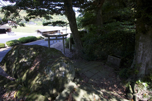 松江市宍道町には、町名の由来になったといわれる「猪石(ししいし)の神話」があります。その神話の舞台装置となる「猪石」の候補となっているのが、宍道町白石にある「女夫岩(めおといわ)」と呼ばれる巨石で、もうひとつの候補が、同じく白石にある「石宮(いしみや)神社」の神体石と鳥居の脇に鎮座する2つの巨石ということだそうです。