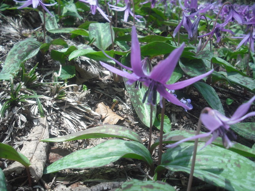 このあたりの尾根道は頂上に近く、風雪が強いために高木は育たないそうです。低木が多く生育しています。草本では、カタクリなど、鮮やかな花を咲かせる種類が咲いています。