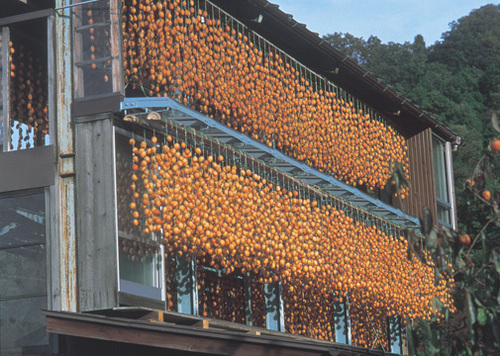 晩秋から本格的な冬にさしかかる11月から師走の12月にかけ、各生産農家の柿小屋には収穫された柿がずらっと垂れ下がり、じっくりと天日に干され、その甘みを熟成、濃縮されるのです。建物全体がオレンジに染まるその光景は、まさに“飴色のすだれ”の表現がピッタリなのです。