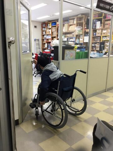 そして、車いすに乗っていざ調査へ。なれない車いすで構内をあちらこちらへ。