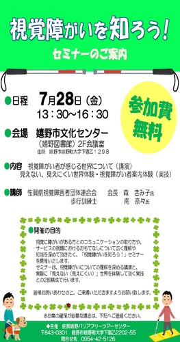 7月28日(金)に嬉野市文化センター(嬉野図書館)2階会議室で「視覚障がいを知ろう」セミナーを開催いたします。詳しくは→http://ameblo.jp/sagaureshino-bftc/entry-12292824207.html