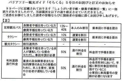 99ページに記載されております「しょうがい者手帳・療養手帳割引一覧」に一部誤りがありましたので、当該箇所を修正させていただきました。ご迷惑をお掛けしました読者の皆様ならびに関係者の皆様に深くお詫び申しあげます。