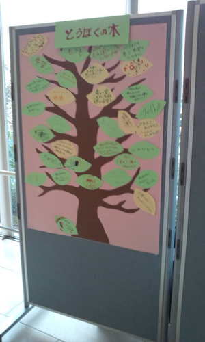 3枚目は、東北の子供たちへのメッセージが葉っぱに書いてある木の形をした作品です。作品名は「とうほくの木」です。