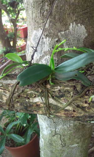 ナゴランとフウランの根を40センチほどの木に糸でくくりつけて、 庭の黐の木 もちの木に針金でぶら下げています。