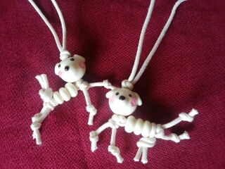 ワンちゃんストラップ。顔と胴体はガラスの玉で、手足・尻尾はひもを結んで作られている。色は全体が白い色です