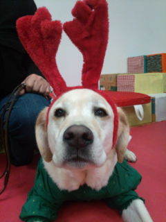 盲導犬のマナーコートは、以前ノア君のお母さん(ノア君が子どもの頃に育ったパピーウォーカーのおかあさん)が作ってくださったクリスマスデザインのマナーコートを着させて行きました。 にあうでしょ (^_-)