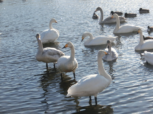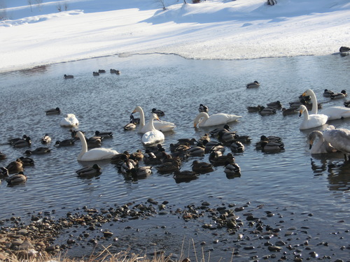 たくさんのカモと20羽くらい白鳥がいましたが水面が凍っていまして