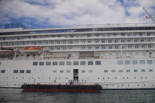 鳥羽港は大型客船が直接接岸できる深さがないため、飛鳥Ⅱは沖合に停船していて