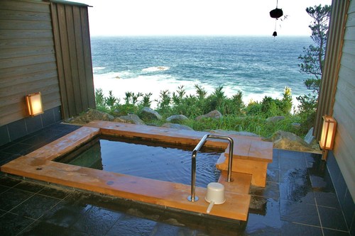 ここのお風呂はすごいんですよー。露天風呂から、太平洋が見えます。