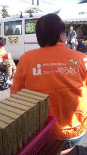 城北公民館祭りのゆうあいブースで古本コーナー。ゆうあいジャンバー!色はオレンジ色ですね。