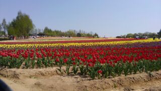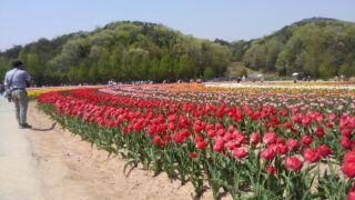 園内の畑に色とりどりのチューリップがたくさん咲いていました。