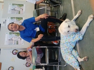盲導犬ふれあいブースにてアランくんとニックネームとしまるの写真です。