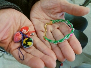 電線で作ったブレスレットは確りしたものでしたね。三つ編みでくふうされていてとても奇麗です。