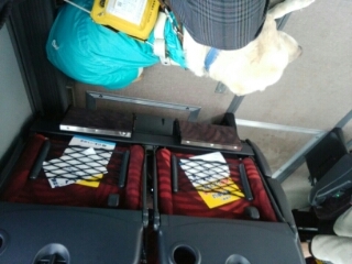 前の席が外されてゆったりした所に寝転んでいるアランくんの写真をのせました。