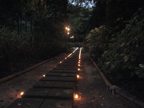 広い境内の約500基の灯籠(とうろう)に迎え火がともされ、境内は幻想的な空気に包まれました。