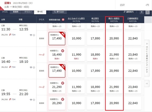 6月最初の月曜日、6/7の日本航空、広島発、東京行きの最安値は、