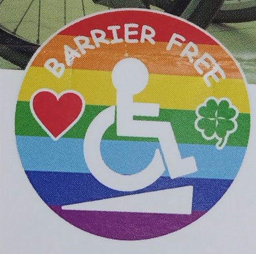 道後の商店街を歩いていると軒先にカラフルな車いすマークのステッカーを貼った