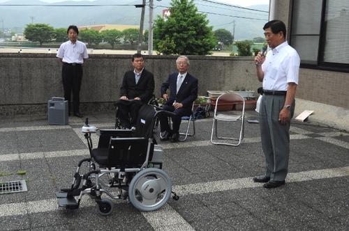 5月27日に嬉野市役所本庁、玄関前広場にて「電動車いす引き渡し式」がありました。