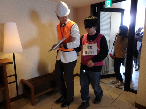 当日はホテルスタッフ、地元消防署、大学生ボランティア、当事者と多くの方々が参加し、バリアフリーネットワーク会議もサポートさせていただきました。