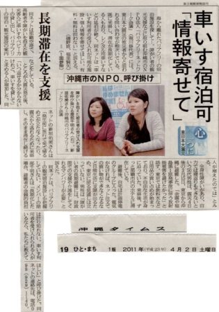 海から離れたバリアフリーの宿泊施設を探して―。障がい者の観光支援などに取り組む沖縄市のNPO法人「バリアフリーネットワーク会議」(親川修代表)には、東日本大震災の被災者からと思われる問い合わせが相次いでいる。既に来県し、滞在が長期化している人もおり、レンタル用車いすなどの延泊が続く。同ネットは「車いす利用者の受け入れが可能な施設・個人情報を寄せてほしい。有料・無料は問わない」と訴える。(磯野直、福里賢矢)