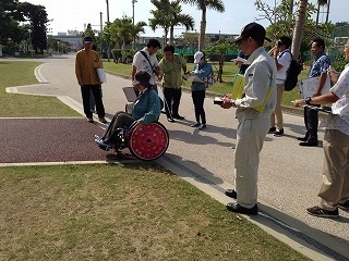 奥武山公園はとても広々とした公園ではありますが、チョットした傾斜や段差であっても実際に車椅子で体験してみることで、参加者の皆さんは難しさを感じることができたようです。
