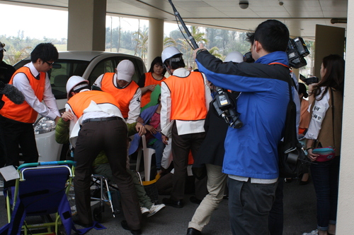 当日はホテルスタッフ、地元消防署、大学生ボランティア、当事者と多くの方々が参加し、バリアフリーネットワーク会議もサポートさせていただきました。
