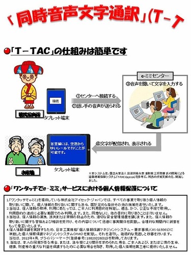 「e-ミミ」は(株)アイセック・ジャパンが行っているサービスで、耳が不自由な人が窓口に訪れた際、タブレット端末画面のスタートボタンを押すとアイセックのコールセンターに接続し、窓口の担当者の言葉を通訳スタッフが文字入力、端末に表示する仕組みです。