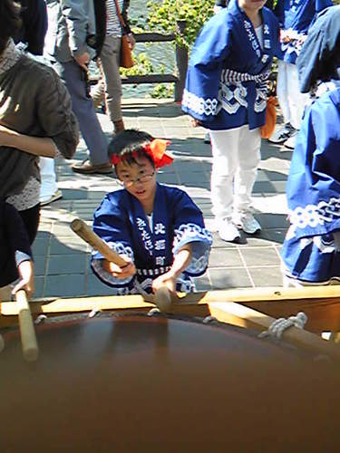 写真は、二男がどう(大きなたいこです)をたたいているところ。