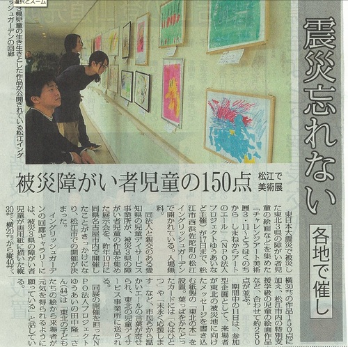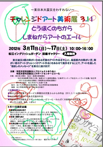 プロジェクトゆうあいでは、障がいのあるお子さんを放課後などにお預かりする児童デイサービスを昨年の秋からはじめていますが、児童デイサービスの関係で、東北とつながりができ、3月11日より1週間、イングリッシュガーデンを会場にして絵画展を開くことになりました。東北の様々な障がいを持つこどもたちが、震災後に描いた絵画150点とともに、松江のこどもたちの絵50点などをあわせて、展示します。