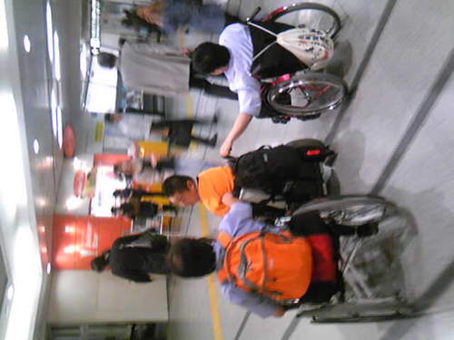 独立行政法人福祉医療機構の助成事業で、 東北地方の支援とバリアフリー旅行をセットにした提案を 日本バリアフリー観光推進機構から提出したのですが、 晴れて採択になりました。 福島、宮城の観光地のバリアフリー調査や、来年の2月には全国バリアフリー観光フォーラムを 仙台で開催することが決定しました。 そのための会議が先日、東京で行われました。 仙台からの伊藤さん、東京の斉藤さん、橋沢さんがクルマ椅子で、 夜の飲み会のあとは、3人が駅構内を爆走!