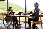 写真はレストランのテーブル席で食事をしているところです。