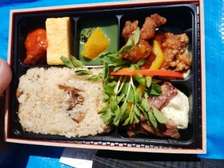 お花見会のお弁当を開いて、(そらまめ)さんのとても美味しそうなお弁当の写真です。