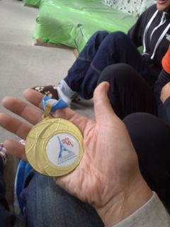 小林さんから世界ちゃんぴょん野銀メダルを触らせていただきました。写真を1枚のせています。