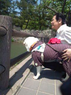 帰りに松江城お堀に亀がいて、亀をのぞくアラン君