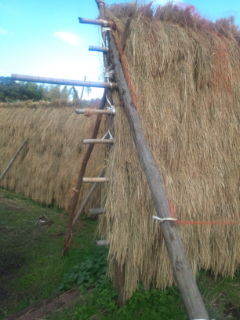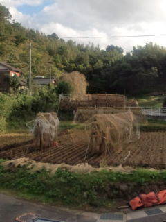 家の前に水田があります。稲刈りが終わり刈り取られた稲をはで木に干されました。