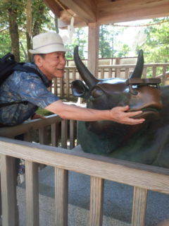出雲大社で牛の像を触っているところ