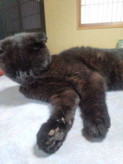 ムサシくん、この暑さに体を伸ばして寝ている写真を1枚写しました。