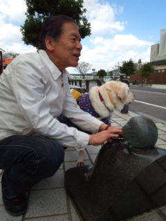 鬼太郎ロードしゃがんでブロンズ像を触っている写真。