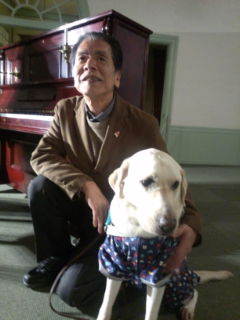 興雲閣ノヴィーウィークコンサートが終り、みんなで記念写真を撮った後、ピアノ(ノヴィー)の前で、としまる&アランでパチリ