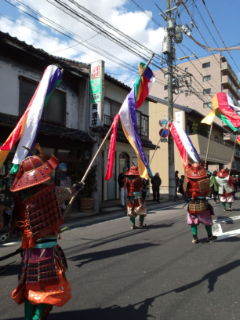 武者行列、吹き流しを掲げて行進。天気でしたが風が多少あり、き流しもはためいていました。