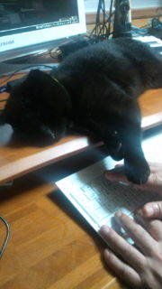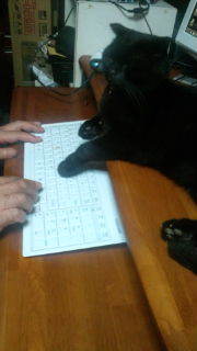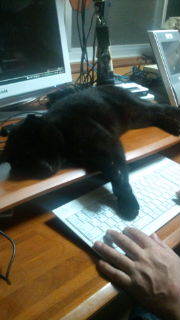 触って見るとムサシ君いますね。 パソコンラックの上で横になっていて少し低い位置のキーボードに前足がたれてかかろうとしていました。