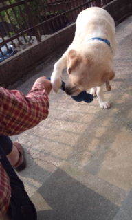 投げてから、オッケー フェッチでおもちゃを取りに行き持ってきますね。