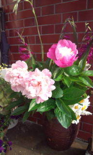 1枚のしゃしんは、近所のかたから芍薬という漢字でしょうか?しゃくやくの花をいただきました。玄関の入り口にいけてあります。