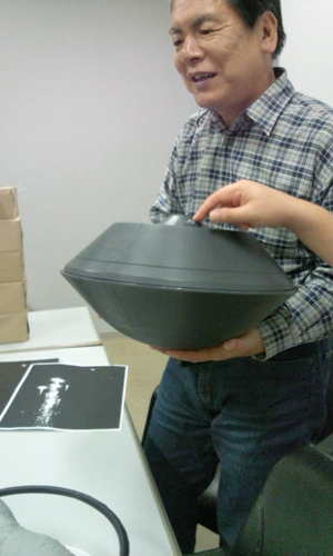 また、 地球に落下した 貴重なカプセル! カプセルの本体の模型を載せます。 本物のカプセルの重量を知るために17キロのオモリも一緒に用意されていますが、 カプセルの写真です。