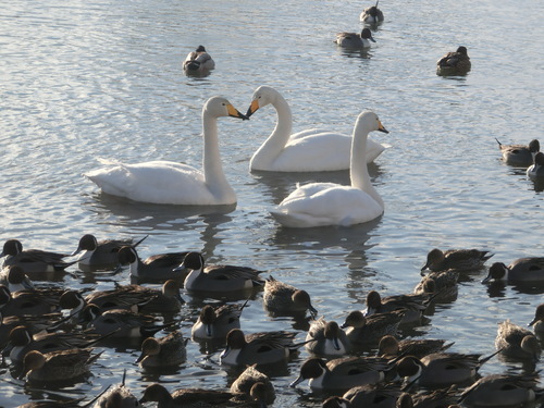 たくさんのカモと20羽くらい白鳥がいましたが水面が凍っていまして