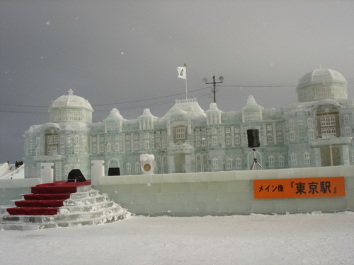 天然氷で作られた大小約40基の氷像や氷の滑り台があって、