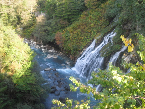 川の青、真っ白な滝の流れが溶け合った神秘的なパワースポットでした。