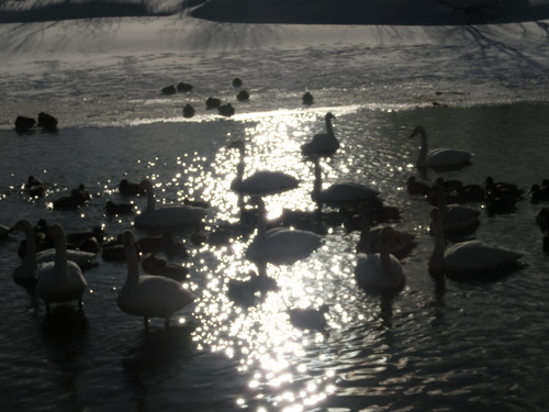 たくさんのカモと20羽くらい白鳥がいましたが水面が凍っていまして